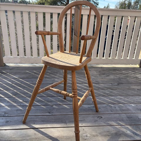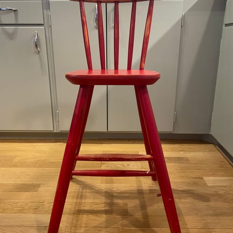 Ikea gråval juniorstol i ljust naturfärgat trä. Stolen har hög rygg med handtagshål upptill, sits i formpressat trä och två fotsteg. Passar som sittplats för barn vid matbord eller arbetsbord. Enkel, stabil konstruktion i trä med korsstag för extra stabilitet.