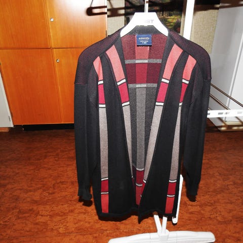Kofta för dam i storlek M. Koftan är flerfärgad med tydliga kontrastfält och är tillverkad i akryl 30 %, Bomull 50 %. Moda 20%. Modellen har öppen framkant utan synlig knäppning och långa ärmar. Passar som vardagsplagg eller som extra lager över topp eller blus inomhus eller vid mildare väder.