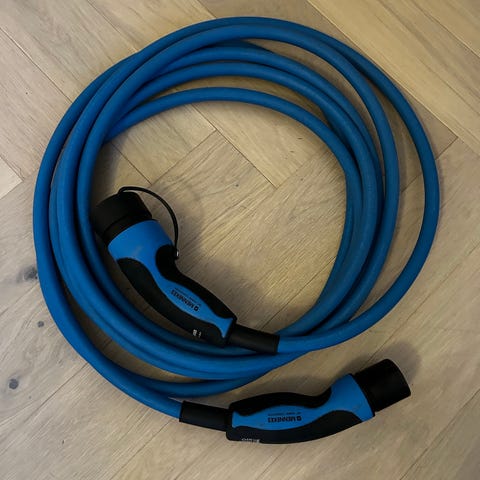 Extra lång 8 meter Mennekes laddkabel för elbil med blåa kontakter och gul kabel. Kabeln är avsedd för laddning av elfordon och har robusta kontakthus i plast. Passar som anslutningskabel mellan laddstation och bil där rätt kontaktstandard förekommer. Lämplig för användning hemma, på arbetsplats eller vid publika laddplatser där kompatibel laddutrustning finns. Lämplig för laddhybrider.