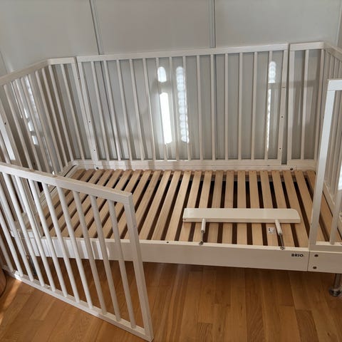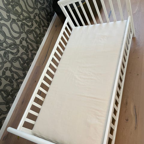 Jollyroom juniorsäng med husformad ram i trä. Mått 70*160. Sängen har sidoräcken runt liggytan. Passar som övergångssäng mellan spjälsäng och vanlig säng för barn. Träramen kan användas för att hänga lättare dekorationer eller belysning. Madrass, kiss skydd och ett dra-på-lakan ingår. I princip oanvänt.