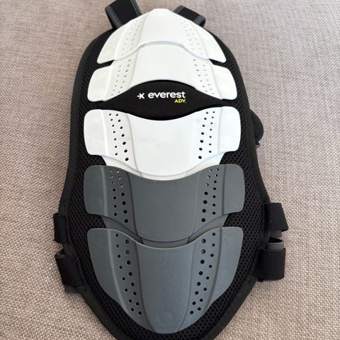 Everest ryggskydd i storlek XXS, perfekt för barn 8-10 år. Modellen har hårda skyddsplattor längs ryggen och bärs med justerbara axelremmar och midjebälte. Yttermaterial i textil med vadderad insida och ventilationspaneler. Färgkombination i blått, vitt och svart med detaljer i rött. Avsett som skydd för rygg vid exempelvis skidåkning eller annan liknande aktivitet där extra ryggskydd behövs.