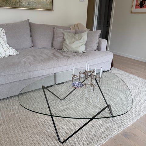 Säljer ett modernt och elegant soffbord med glasskiva och svart metallstomme. Bordet ger ett lyxigt och luftigt intryck och passar perfekt i ett stilrent vardagsrum.