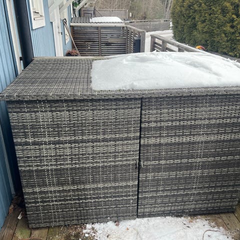 Trädgårdslåda förvaring med hjul i brunt trä. Lådan har lock som kan öppnas uppåt och ribbad konstruktion runtom. Utrustad med två hjul på ena sidan för att underlätta förflyttning. Passar för förvaring av till exempel dynor, trädgårdsredskap eller annan utrustning på altan eller balkong.