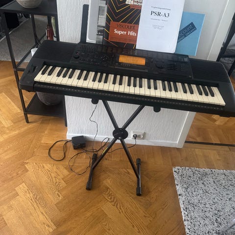 Yamaha PSR-E323 keyboard med 61 fullstora tangenter. Utrustad med inbyggda högtalare, display i mitten samt ett antal funktionsknappar för olika ljud, stilar och inställningar. Notställ och X-stativ för golvplacering ingår enligt bild. Passar för övning, hemmabruk och enklare musikproduktion.