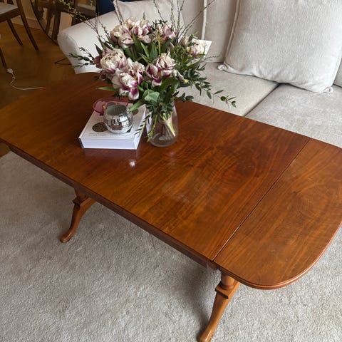 Vackert gammalt spelbord. 98 cm utan utfällda sidor, den utfällda delen på varje sida är 23 cm. Hämtas
