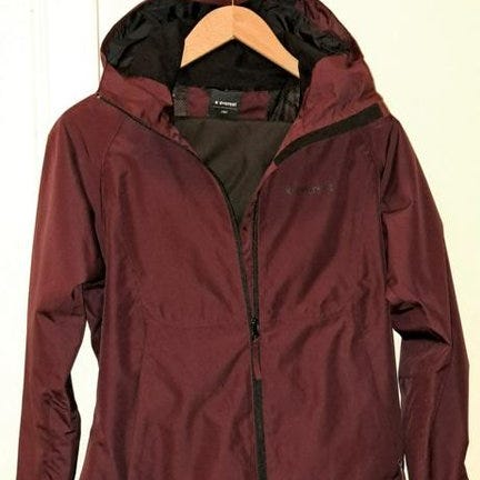 Peak Performance skidställ för dam, set med jacka och byxa i storlek M. Plastpärlor som ska sitta på vänster bröstkorg har ramlat av i någon pist, därav tre små hål. Inga övriga defekter.