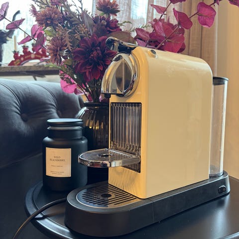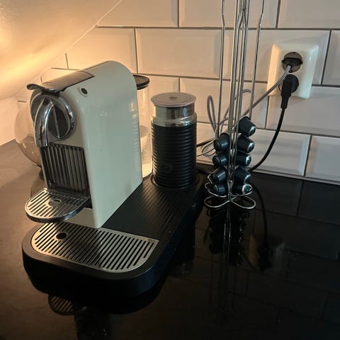 Nespresso espressomaskin kapselmaskin i röd färg. Maskinen använder Nespresso-kapslar och har vattenbehållare på baksidan. Droppgaller och koppställ i metall framtill. Lämplig för bryggning av espresso och andra kaffedrycker med Nespresso-kapslar i hem- eller kontorsmiljö.