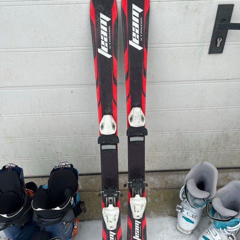 Till skidorna hör TecnoPro T40 JR pjäxor i svart, vit och röd färg.