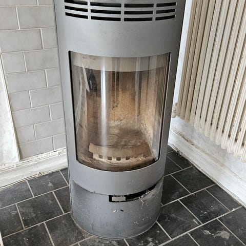 Kaminen är klädd med eldfast material och galler i botten för askuppsamling. Rökrörsanslutning finns upptill. Under eldstaden finns förvaringsutrymme bakom lucka.