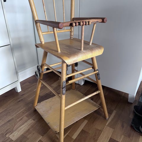 Stol med sits klädd i fårskinn. Ryggstöd i trä och ben i metall. Sitthöjd: 37cm