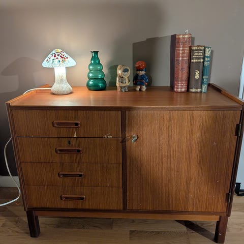 Litet sidobord/hallbänk i teak med låda och en flyttbar under hylla.