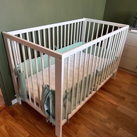 Detta är en äldre modell där det inte går att ta bort en långsida, och den kan därför inte göras om till bedside crib.