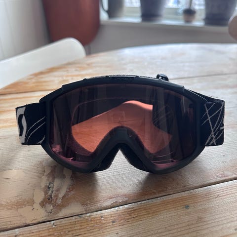 Skidglasögon med blå spegellins och svart ram. Justerbart elastiskt band runt huvudet. Modellen är avsedd för unisex-användning och täcker ett stort synfält. Passar för skidåkning eller snowboardåkning i varierande ljusförhållanden.