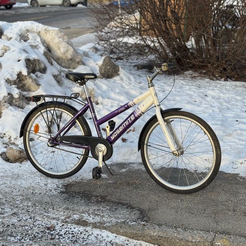Fungerande cykel från Sjösala. Stått ute så begagnat skick. Stödhjul går monteras av.