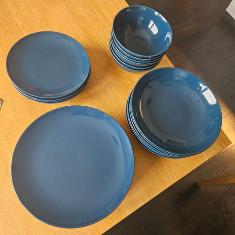 IKEA porslin och glas set i blandade färger. Setet består av tallrikar i olika storlekar i mörkgrått och brunt, flera dricksglas i klart och ljust lila glas, blå muggar samt ett större blått serveringsfat/skål med upphöjd mittdel.