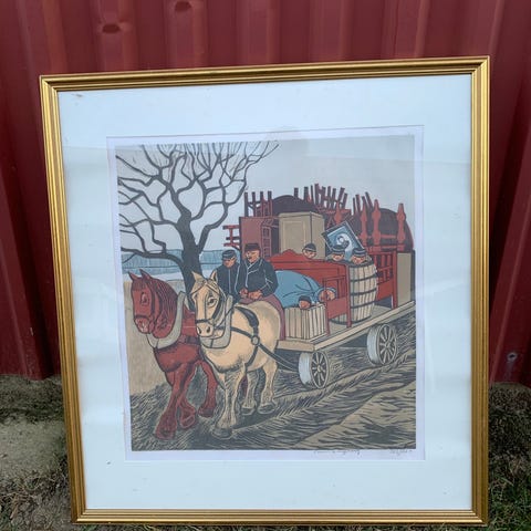 Johan Lundgren konstgrafik vintermotiv hästar skogsarbete