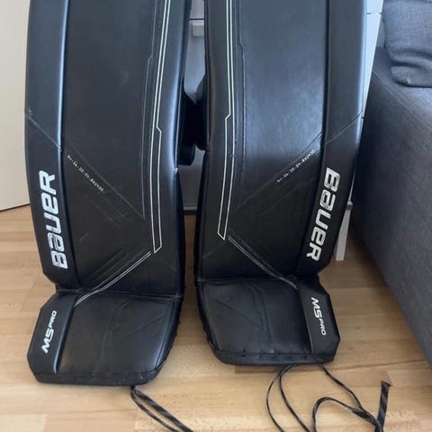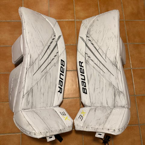 TPS Xceed målvaktsbenskydd i vit och svart färg. Benskydden är avsedda för ishockeymålvakt och har kraftig vaddering samt remmar på baksidan för justering och fastsättning.