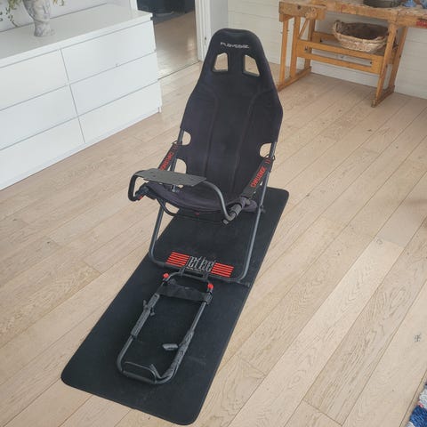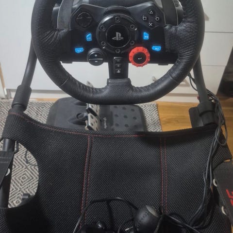 Logitech G29 racerratt med pedaler och Playseat racingsäte i svart färg. Ratten har inbyggda knappar anpassade för PlayStation samt paddlar bakom ratten för växling. Pedalenheten har tre pedaler för gas, broms och koppling. Playseat-riggen består av ett racingsäte med ram i metall, monteringsarm för ratt samt plats för pedalställ. Utrustningen är avsedd för racingspel och körsimulatorer i hemmamiljö.
