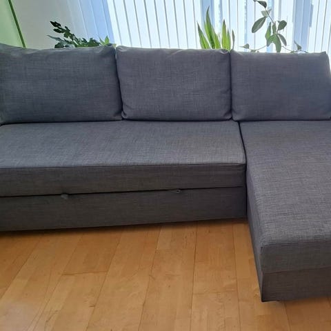Mio hörnsoffa i grått tyg. Soffan har flera sittplatser med raka rygg- och sittdynor samt schäslongdel. Klädseln är i vävt tyg och soffan står på golv nära vägg. Passar som vardagsrumssoffa för sittande och vila. Sista bilden visar läng bredd osv.