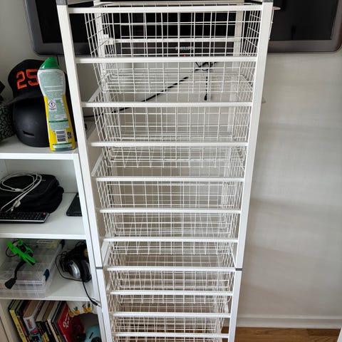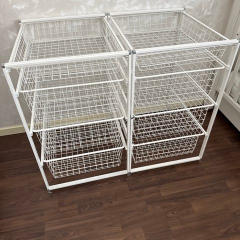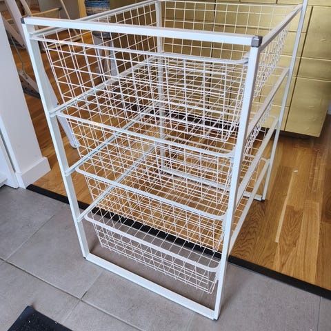Elfa förvaringssystem med flera sektioner av trådbackar i vitlackerad metall. Systemet består av fristående stativ med utdragbara korgar/trådbackar i olika höjder, lämpliga för exempelvis klädförvaring, hallförvaring eller förvaring i förråd och tvättstuga. Konstruktionen är öppen med nätkorgar som ger god överblick och ventilation av innehållet. Passar att placera direkt på golv under exempelvis trappa eller i garderob.