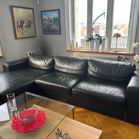 En mycket fina och välvårdade svart skinnsoffa från design märket Natuzzi från Italien. En 3a (4500:-) men modellen är en aning större, det får alltså plats 4 personer i 3an Nypris 20 000:-!