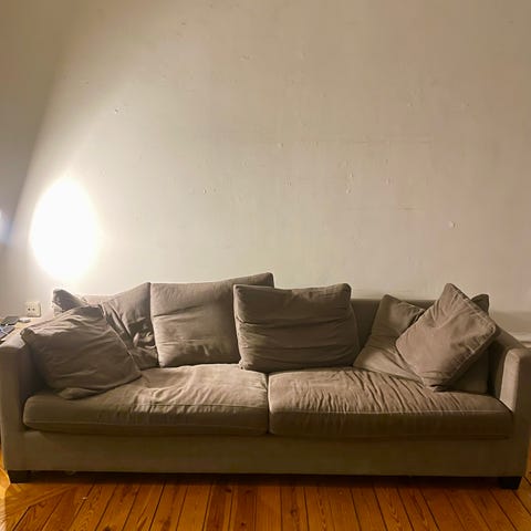 Klädseln på sitsen är inte helt ren, vi har skurat den men det finns missfärgning efter spilld dryck, så lägg en filt över sitsen eller klä om hela soffan om du är händig. I övrigt hel och stabil. Hämtas gratis mitt på Södermalm.