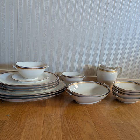 Rörstrand porslinservis i vit färg med dekor i form av små blå blommor och guld- eller bronsfärgade detaljer. Servisen består av tallrikar i olika storlekar samt en kanna.