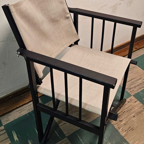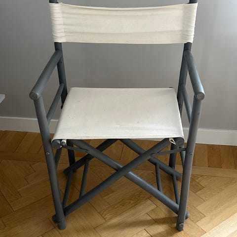 Säljer en vit regissörstol med lite fläckar på tyget men det går att ta av och tvätta