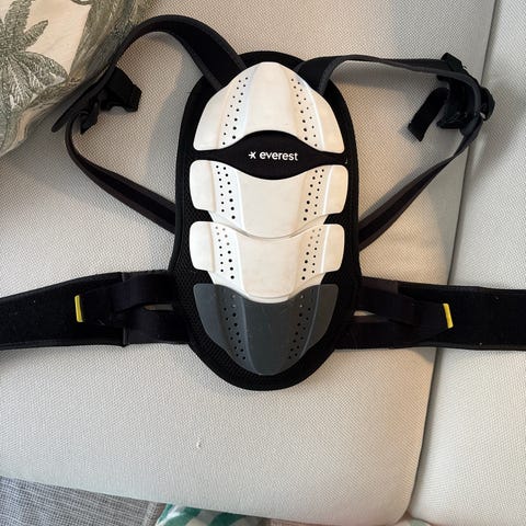 Everest ryggskydd för barn. Stl 128-140. Ytterskal i vit hårdplast med flera ledade skyddsplattor och svart vadderad insida med blå kant. Justerbara midjeremmar med kardborre för att kunna anpassa passformen runt midjan. Avsett som skydd för rygg vid exempelvis skidåkning, snowboard eller annan sport där extra ryggskydd behövs. Färgkombination i vitt, svart och blått. Barnstorlek enligt etikett (ca 135–140 cm).