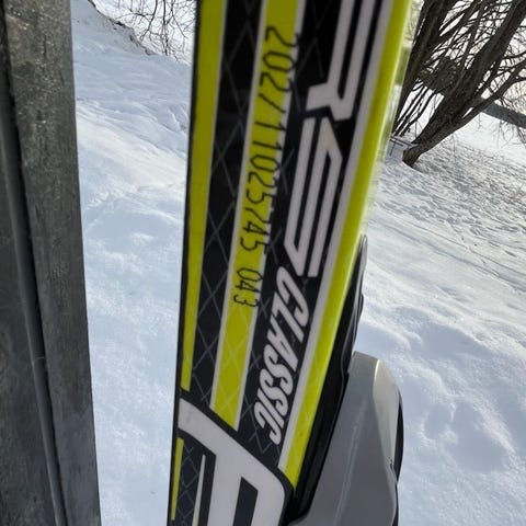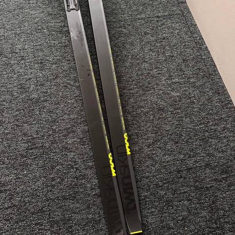 Fischer Twin Skin Race längdskidor i svart färg. Modellen är ett par klassiska skidor med integrerad stighud (twin skin) för fäste utan fästvalla. Skidorna har märkning med spannkurva och hårdhet (94 ± 5, CHFV 0,71 mm) enligt etiketten på belaget. Jag skulle säga att de passar bättre för 80-90 kg. Passar för klassisk längdåkning och träning.