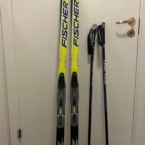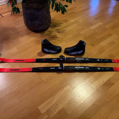 Skidorna har bindningar monterade. Stavarna är anpassade för längdskidåkning och pjäxorna är kompatibla med monterade bindningar.