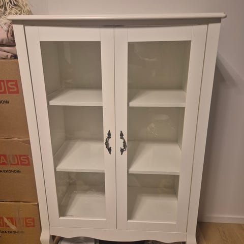 Byrå med 4 lådor, översta lådan med frostat glas. Resten av byrån är i vitt.