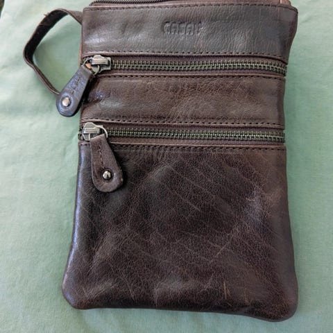 En super fin brun skinnväska från Ulrika. Den mäter B: 18 cm H: 12 cm D: 5,5 cm. Finns litet fack på framsidan och inuti som både stäng med blixtlås. Den är i skinnet mjuk och skönt. En reglerbar axelrem ingår så den kan bäras som du själv önskar. En högkvalitativ liten väska för det allra nödvändigaste.