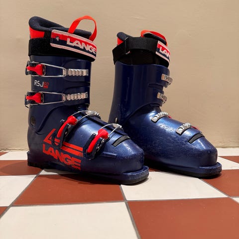 Lange RSJ 60 alpina pjäxor i blå plast med orange och silverfärgade spännen. Modellen är en fyrspännespjäxa med justerbara metallspännen och rem upptill för stabil passform. Innerstövel med mjuk vaddering för komfort. Passar för alpin skidåkning. Märkta med RSJ 60 på sidan och Lange-logotyp bak och på skaftet.