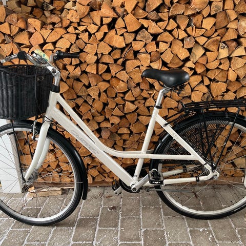 Smidig och lättcyklad modell med pakethållare och korg. Helt nya däck monterades 2022.