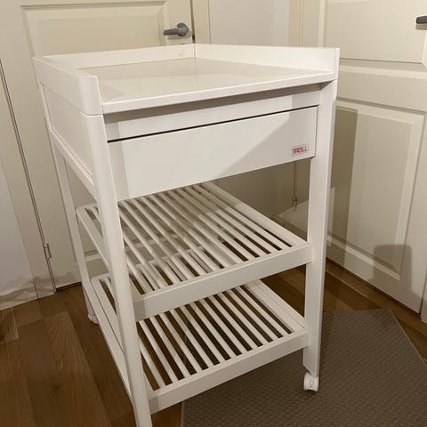 När barnet är större kan man enkelt ta bort skärbords-delen och använda den som byrå. För mått se bilder.