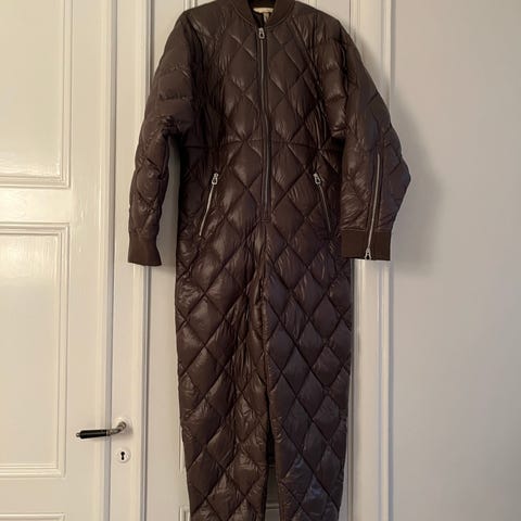 H&M quiltad overall för dam i storlek L. Ytterplagg i svart polyester med huva och hel dragkedja framtill. Quiltad design med markerad midja och långa ben. Muddar vid ärmslut och praktiska detaljer för bättre passform. Passar som bekvämt och skyddande ytterplagg vid svalare väder.