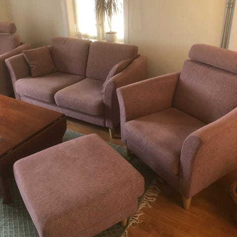 Vacker och stilren i mörkt Olivfärgat skinn med lika fotpall, ca 3 månader. Nypris 30.000.