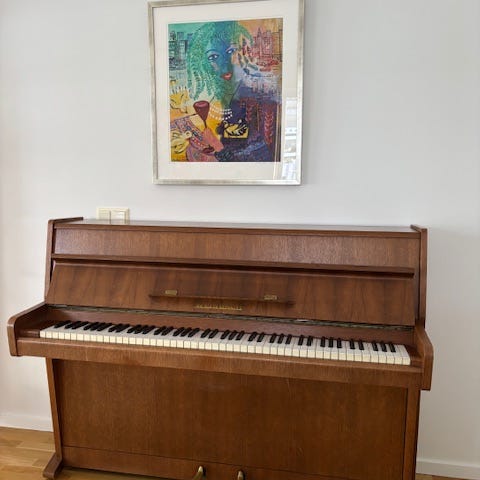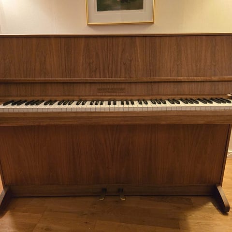 Akustiskt upprätt piano med träfaner och klassisk design. Pianot har fullstor klaviatur med vita och svarta tangenter samt två pedaler. Passar för hemmabruk, övning och musikundervisning. Ytfinishen är i trä med traditionell formgivning och raka linjer upptill samt svängda ben nedtill.