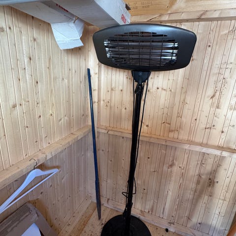 Infravärmare i svart utförande. Två enheter syns på bilden, avsedda för uppvärmning av exempelvis uteplats, balkong eller liknande utrymmen. Utrustade med skyddsgaller och elkabel med stickkontakt för anslutning till vägguttag. Kan monteras på vägg eller annat lämpligt underlag med hjälp av fästen på ovansidan.