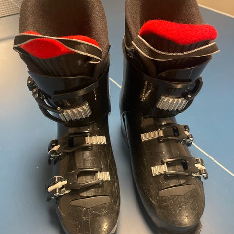 Tecnopro T40 alpina pjäxor i storlek 230 mm. Ytterskal i svart och vit plast med röda detaljer och grått, vadderat innerfoder. Justerbart spänne över skaftet. Passar för alpin skidåkning för barn. Sula anpassad för montering i vanliga alpina bindningar.