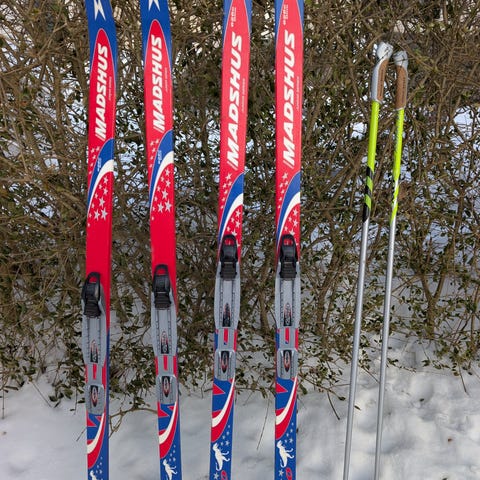 Edsbyn längdskidor 130 cm med stavar, pjäxor