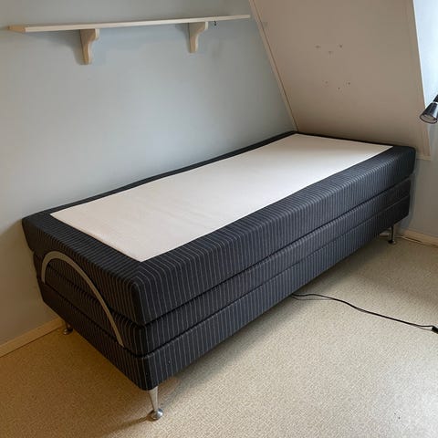 Väldigt komfortabel höj- och sänkbar säng i fint skick, där allt funkar helt som det ska. Det går att höja både huvud- och fotänden av sängen, som visas i fotona. Styrs med en fjärrkontroll som är kopplad med sladd till sängen.