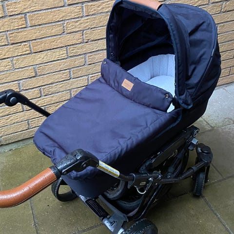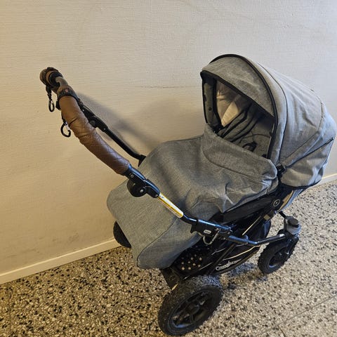 Mycket praktisk barnvagn med stora svängbara luftfyllda däck som tar sig fram överallt.