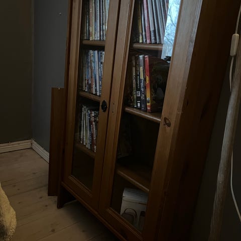 IKEA bokhylla (troligen Billy) med vitrindörrar och hörnhylla.