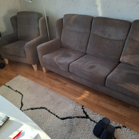 Brun soffa köpt på möbelhuset i Luleå betalade drygt 16.000 kr o den är inte ett år gammal bekväm att sitta i denna trea . Vid intresse skickar jag bilder på den