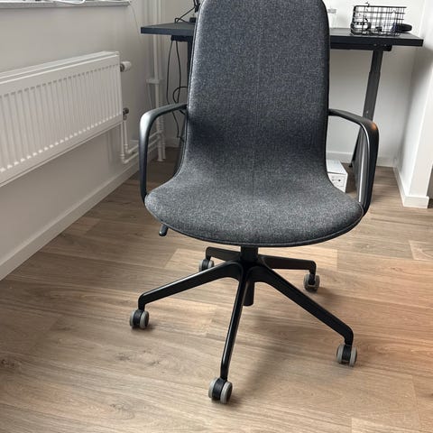 IKEA kontorsstol långfjäll. Stolen har klädsel i grått tyg och svängbart underrede med hjul. I bra skick men finns några repor på armstödet. Utrustad med fasta armstöd i svart utförande. Lämplig som arbetsstol vid skrivbord i hem eller kontor.
