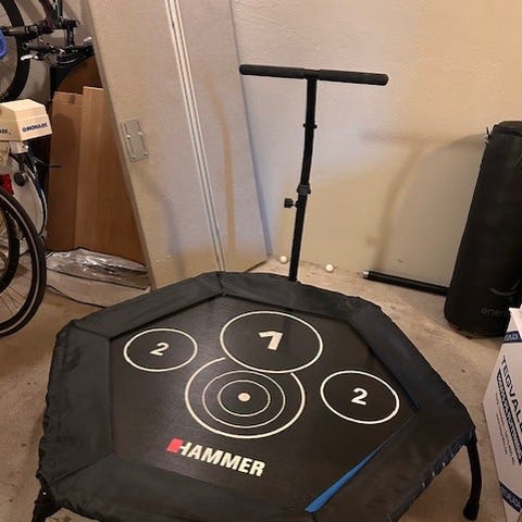 Songmics studsmatta i mycket gott skick. Diameter 102 cm, höjd 34 cm. Högsta användarvikt 120 kg. Justerbart handtag (110cm - 130cm höjd) som enkelt kan tas bort. Ej påmonterat för tillfället, för studsmattan har förvarats i källaren med handtaget avmonterat. Avsedd för inomhusträning för vuxna. Stålram och polypropylen matta. TYSTA fjädrar. Jag gillar verkligen att man inte hör något gnissel när man studsar. Fjädrarna är täckta, så det är ingen risk för att klämma tårna.