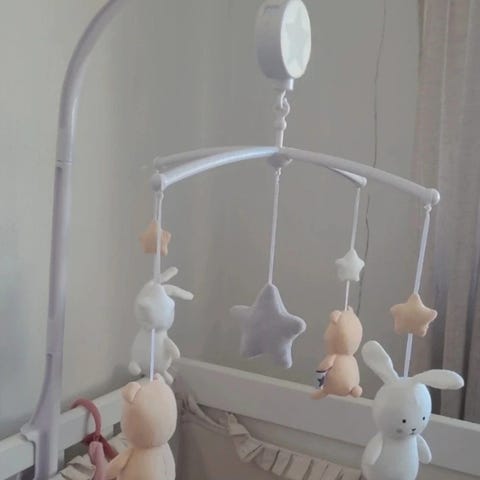 Säljer en mobil i trä med elefanter, stjärnor och moln från Jabadabado tillsammans med en speldosa som roterar och spelar musik samt en hållare till mobilen.
