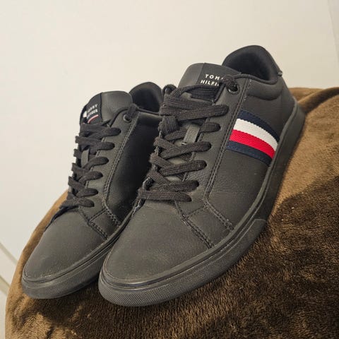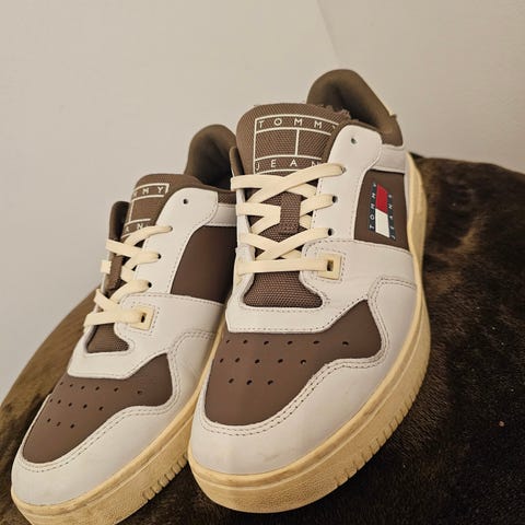 Tommy Hilfiger sneakers i storlek 41. Låga sneakers med snörning och gummisula. Flerfärgad design i blått, vitt och gult med logodetaljer på sidor och plös. Passar som vardagsskor och fritidsskor.